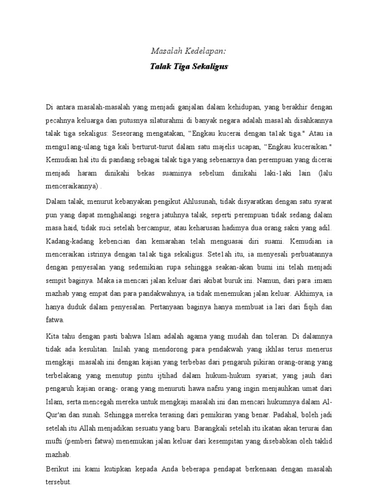 Tasdiqul Qur An Hukum Talak 3 Bagi Istri Jika Seorang Suami Mengatakan Kepada Istrinya Kamu Saya Talak Tiga Dengan Sadar Dan Memahami Apa Yang Dia Katakan Ketika Diucapkan Maka Talak Seperti Ini